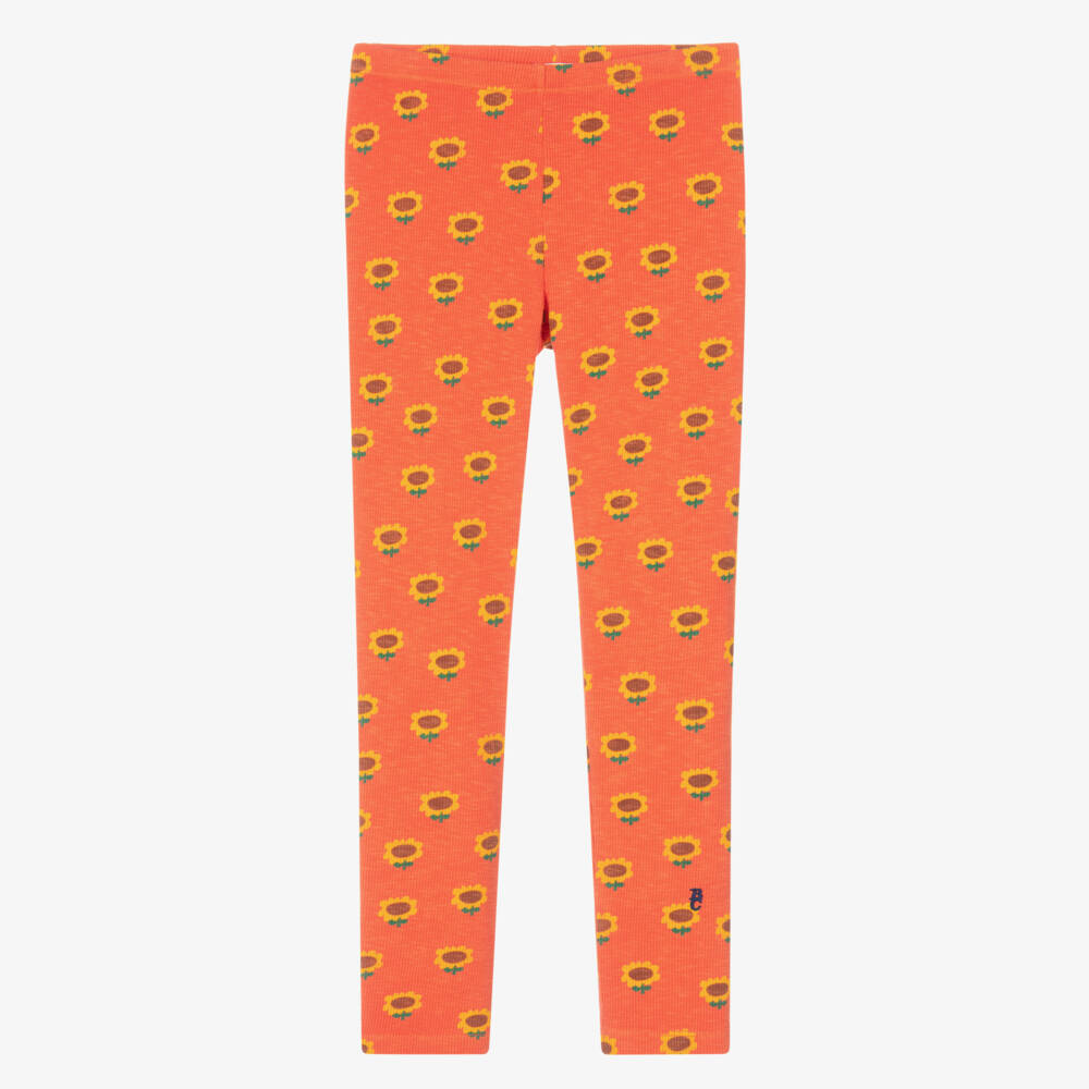 Vibrant orange leggings for girls by Bobo Choses, with a yellow and brown sunflower pattern. Super soft and stretchy, they are made in organic cotton ribbed jersey and have a comfortable elasticated waistband.