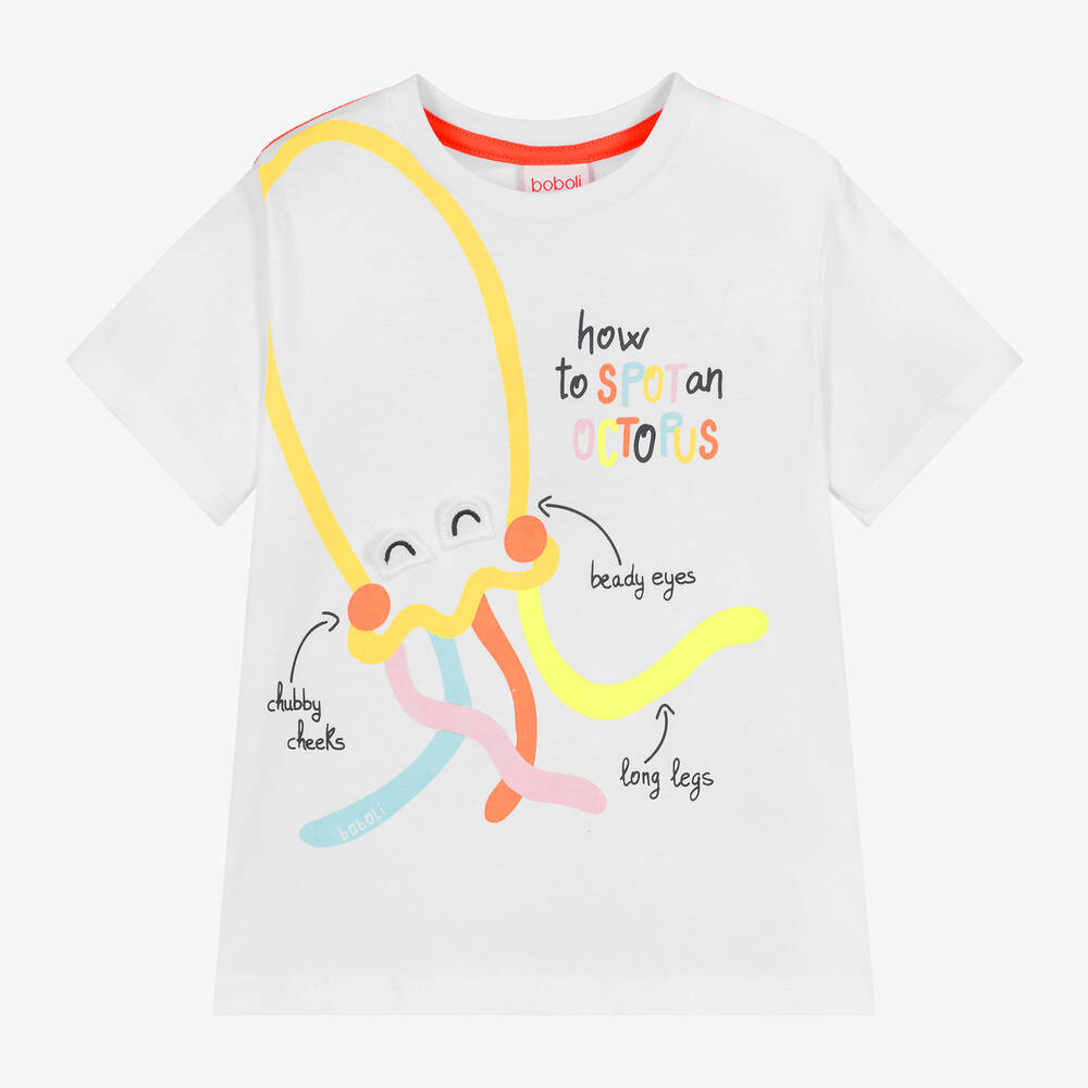 A casual white short-sleeved T-shirt for boys by Boboli, made from soft and stretchy cotton jersey. Fun and colourful, it has an interactive 'how to spot an octopus' design to help your little one learn about our ocean.