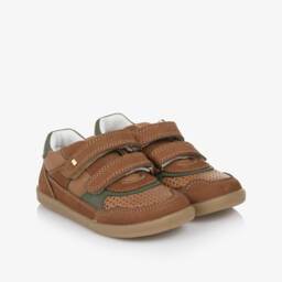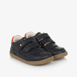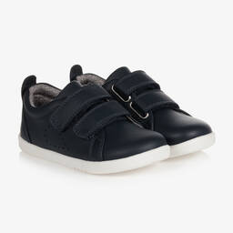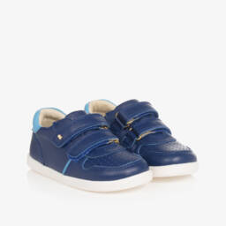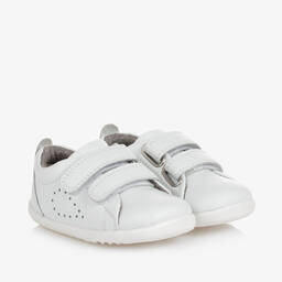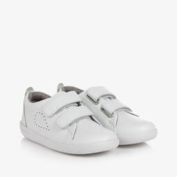Sporty and lightweight white trainers for little boys by Bobux IWalk, with contrasting blue trims. Ideal for active play, they are made and lined in premium leather with a lightly cushioned insole, padded ankle and a flexible, non-slip rubber outer sole. They fasten with an adjustable velcro strap for a secure, comfortable fit.