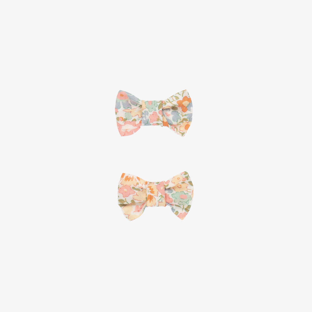 From French brand Bonpoint, a pack of two hair clips for girls made in cotton poplin with a beautiful pink floral print. These charming bow clips are a pretty addition to an outfit.