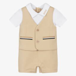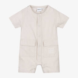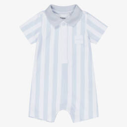 A sweet pink cotton shortie for baby girls by BOSS, patterned with Double B monogram logos. Made in soft and comfortable piqué, it has contrasting pink piping and easy popper fastenings on the front, with a branded popper at the neck.