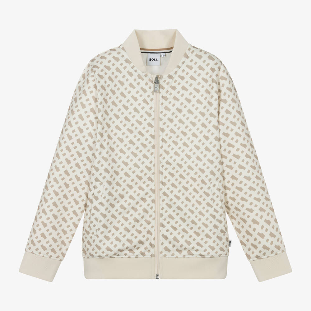 A monogram print zip-up top for boys by BOSS, designed in tonal beige colourways for a cool retro look. Made in comfortable and smooth jersey, with a gentle stretch, it has ribbed trims for added cosiness. It has a branded silver zip puller with a useful chin guard and two front pockets.