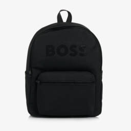 A small black backpack for younger boys by BOSS, patterned with the brand's monogram logo for instant designer appeal. It has a zipped front pocket, useful side pockets for bottles and a zipped main compartment lined in silky beige satin. The back and adjustable, beige-trimmed shoulder straps have padded mesh for comfort and there is a coordinating beige canvas carry handle on the top.