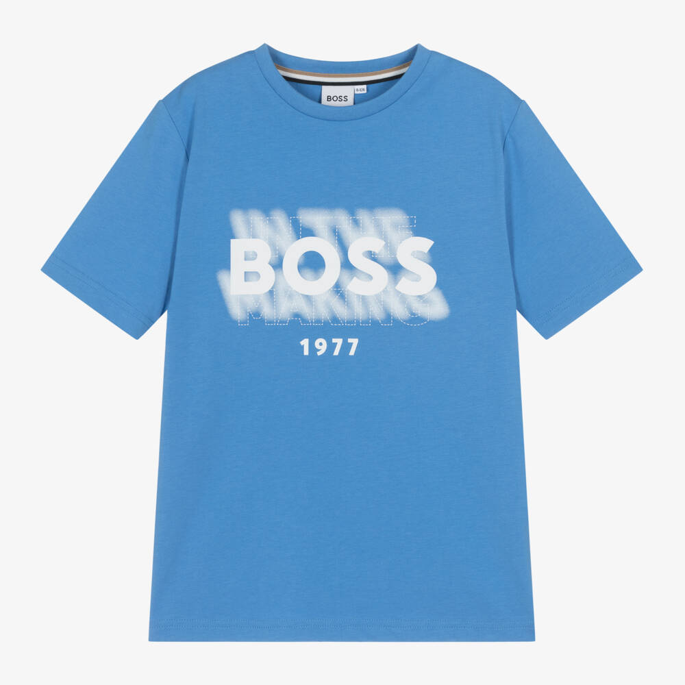 Cool and casual blue cotton T-shirt for boys by BOSS. The front has a bold white graphic logo print, together with 1977, marking the historic year of the brand.