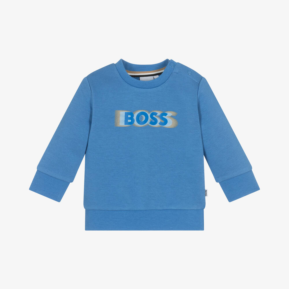 A bright blue sweatshirt for little boys from BOSS, with a beige and blue shadow-effect logo print. It is made in soft cotton blend jersey with a looped underside for cosy comfort and poppers on one shoulder to assist with over-the-head dressing.