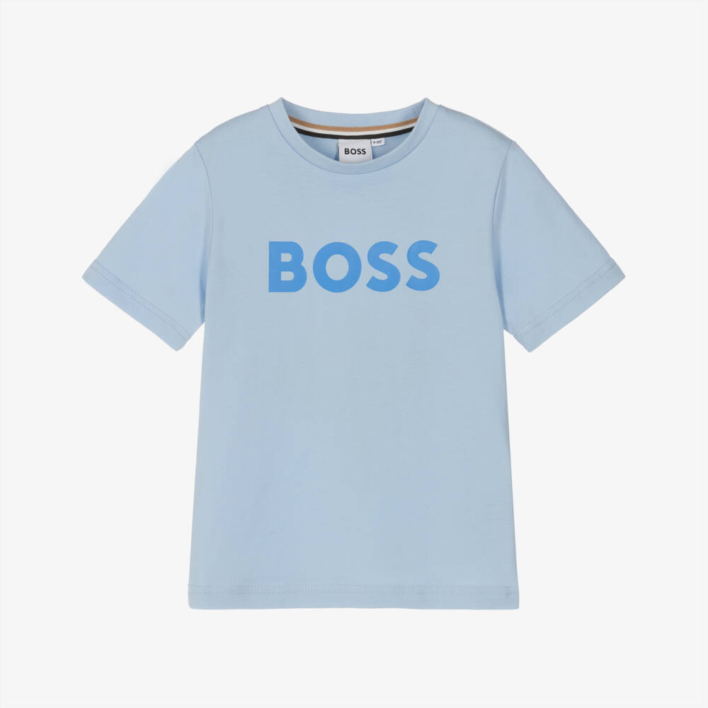 Light blue T-shirt for boys by BOSS, made in comfortable cotton jersey. This casual tee features the brand's signature logo in blue on the front, with their distinctive tricolour trim on the inside neck.