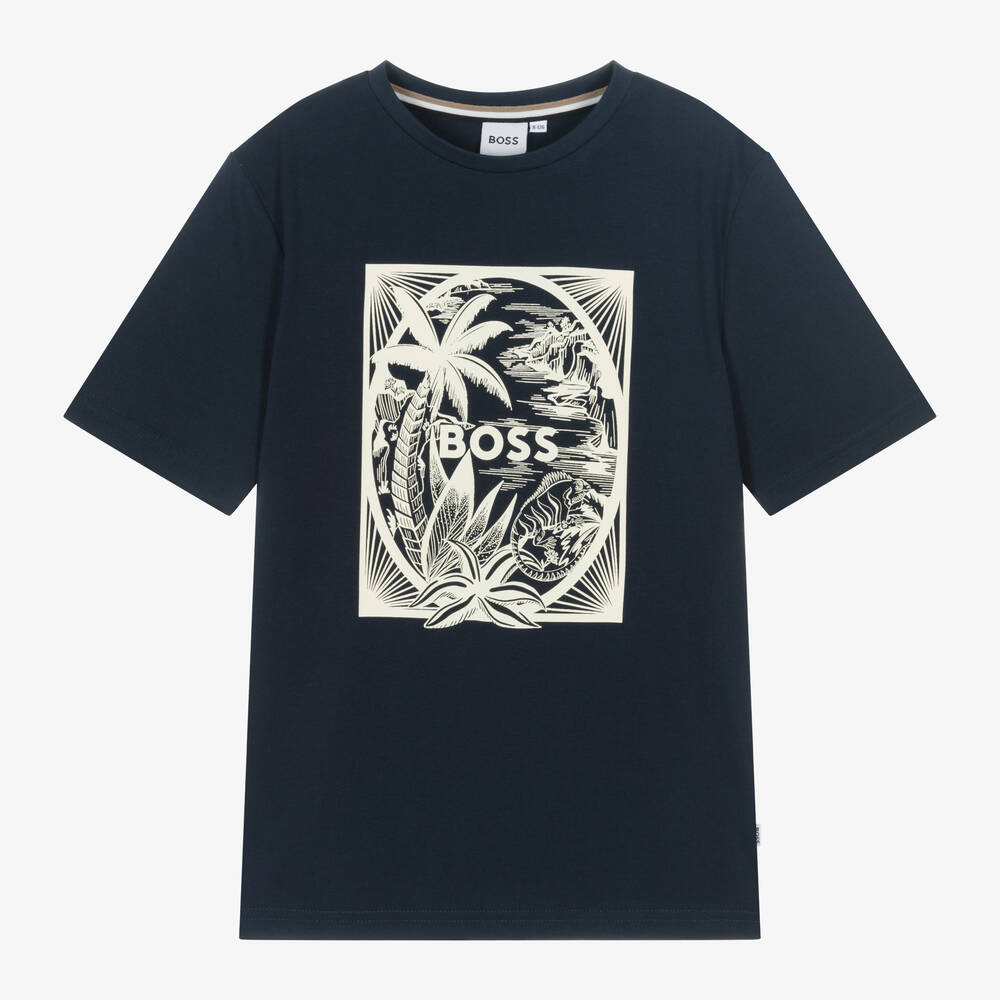 A navy blue T-shirt for boys by BOSS, made in soft cotton jersey. A large tropical print with the brand name is printed on the front.