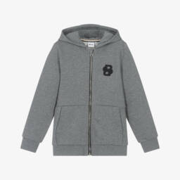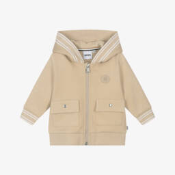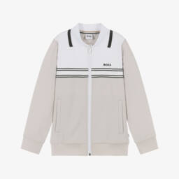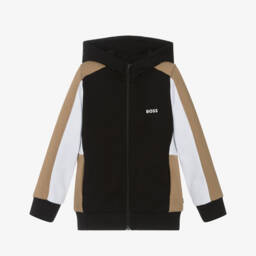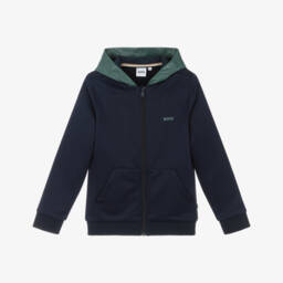 Boys navy blue zip-up top by BOSS, made in soft, mid-weight cotton jersey. Great for everyday casual wear, this comfortable top has a distinctive white logo printed on the chest and useful front pockets.