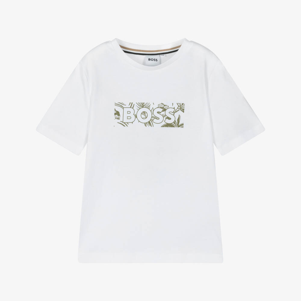 A timelessly stylish white cotton T-shirt for boys by BOSS. Cool and easy to wear it has the designer's name amongst a palm leaf print for a branded look.