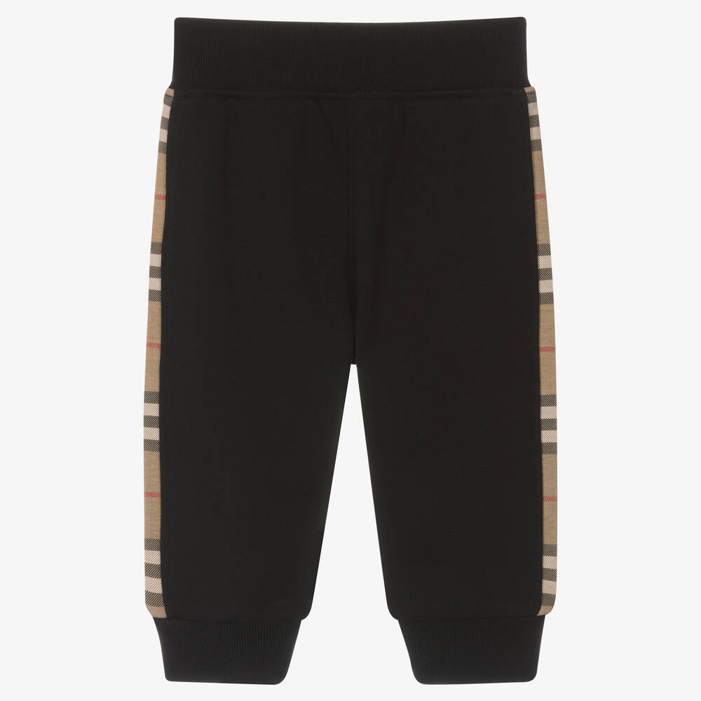 Casual black jersey joggers for baby boys by luxury British fashion house Burberry. For a distinctive look, they are trimmed with the brand's Vintage check pattern on the sides in beige, black and red. They have an comfortable elasticated waist, ribbed ankle cuffs, and a useful slip pocket on the back. This product contains organic cotton.