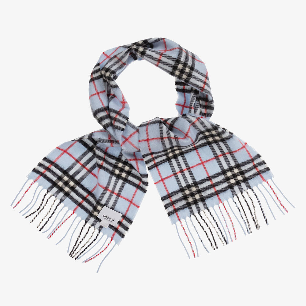 In the brand's iconic Vintage check, blue cashmere scarf for boys and girls by luxury British brand Burberry. Traditionally woven at a 200 year old mill in Scotland using traditional looms, it has classic fringing at both ends for a timeless look.