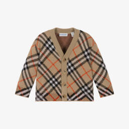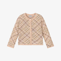 A beige knitted cardigan for girls from Burberry, made in pure wool for luxurious softness and warmth. The design is panelled in the brand's signature beige, red, ivory and black Icon Stripe pattern for that unmistakable Burberry look. Fastening with classic mock horn front buttons, there are patch pockets, one of which has a rubberised Equestrian Knight Design and oak leaf crest logo appliqué in coordinating colours. This garment is made with responsibly sourced wool.