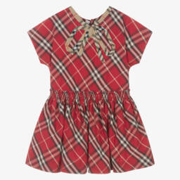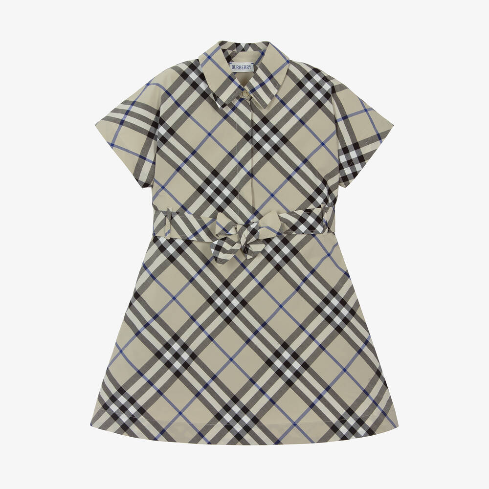 A grey shirt dress for girls by luxury British label Burberry. Made from lightweight poplin, it is patterned with their iconic Burberry Check in shades of black, white, and blue for a signature look. Cool and casual, it has a pointed collar, seamless short sleeves, and a detachable belt that can be tied in a bow on the front. It has a concealed zip fastening on one side and concealed buttons on the front for a neat finish. This product contains organic cotton.