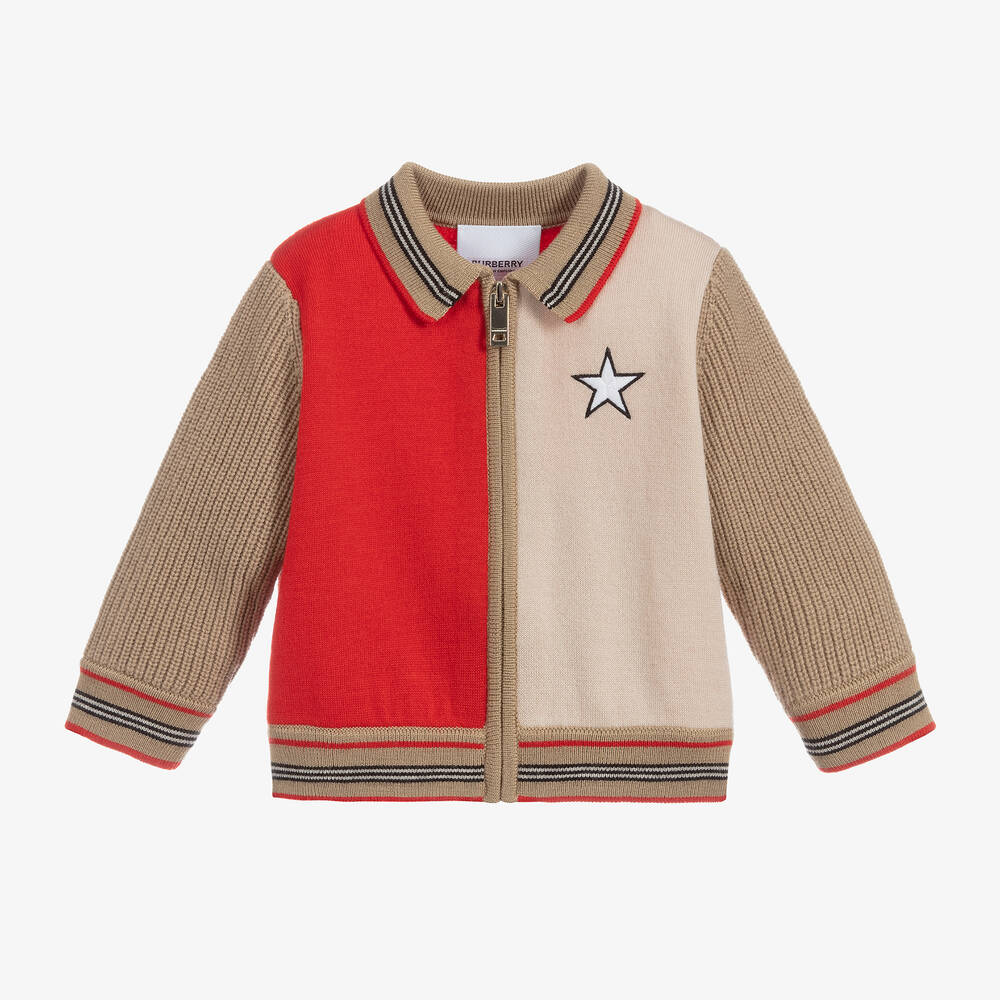 Little boys charming red and beige colour block zip-up top by luxury brand Burberry. It is beautifully knitted in a wool and cashmere blend with ribbed sleeves and the Icon stripe trims. It has embroidered white logo on the back and a white star appliqué on the chest.