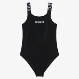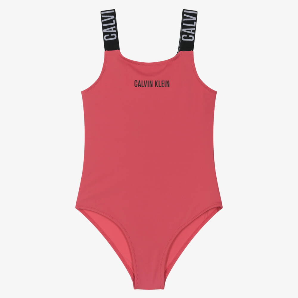 Deep crimson pink swimsuit for older girls by Calvin Klein, made in silky smooth and stretchy fabric with recycled fibres. This partly lined one-piece has a scoop neckline and a black logo print on the front. It has elasticated shoulder straps with signature Calvin Klein branding.