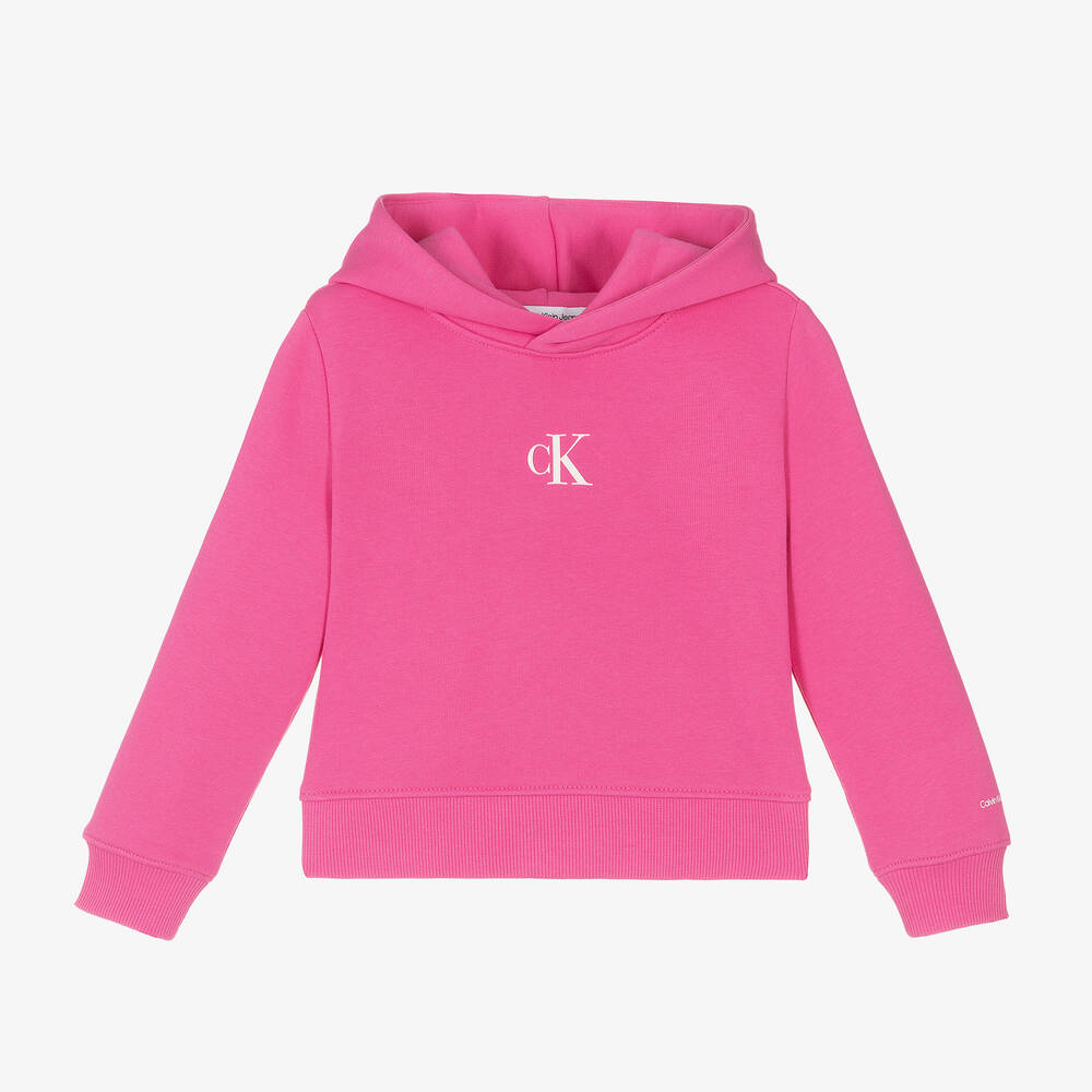 A bright pink boxy-fit hoodie for girls by Calvin Klein, made from soft and comfortable cotton jersey. Cool and casual, it has a white rubberised Calvin Klein monogram logo on the front and a signature print on one sleeve.