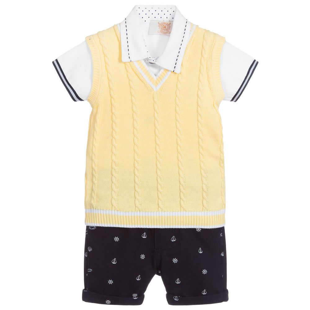 Little boys three-piece shorts set by Caramelo Kids, made in soft cotton. The yellow and white slipover is knitted with cable detailing. The lightweight shirt has navy blue stripes, spotty trims and stitched detail on the collar. The navy blue twill shorts are printed with white nautical icons.