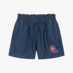 Blue shorts for girls by Catimini, made in soft, lightweight cotton poplin. Combining comfort with style, they have an elasticated, paper bag waistband with a charming bow detail. Cool and casual, they have pleats on the front for a fuller look and side seam pockets.