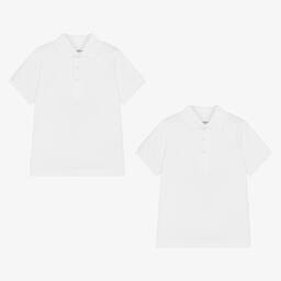 Pack of two organic cotton short-sleeved polo shirts for boys by Childrensalon Essentials, in pale blue and navy blue. Made in soft, comfortable piqué, they have traditional polo styling with a ribbed collar and front button fastenings.