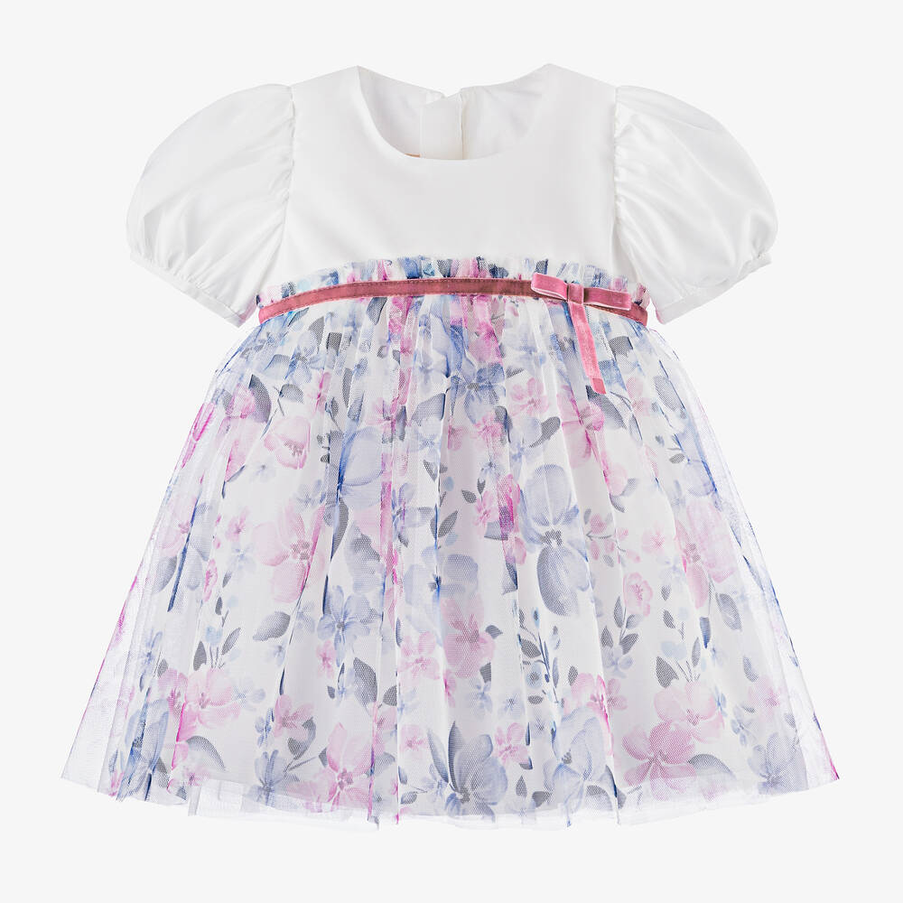 Lovely white, pink and blue dress for little girls by British brand Childrensalon Occasions. Ideal for a special event, it has a white satin bodice with pretty puffed sleeves and a neat, concealed zip fastening on the back. The lightweight tulle skirt has a delicate floral pattern, with a ruffle and pink velvet trim around the top. The dress is fully lined in comfortable cotton voile.