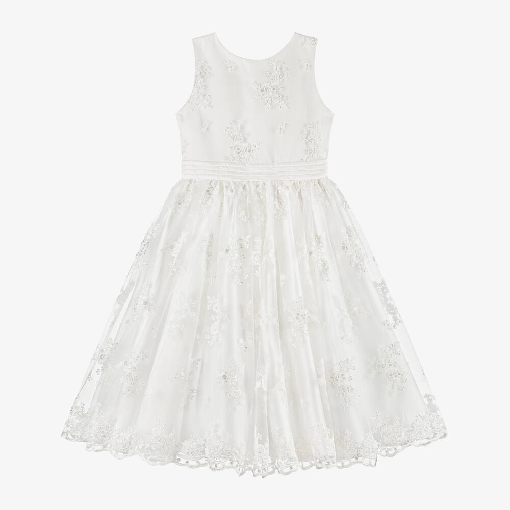 Elegant long white dress for girls by Childrensalon Occasions, designed for special events and ceremonies. Made in sumptuous satin twill with a delicate tulle overlay, it is beautifully embroidered with ivory flowers. It has a pleated waistband and decorative, satin-covered buttons around the back, running alongside the discreet, concealed zip fastening. The dress has net and tulle underskirts for extra volume and is lined in soft voile for comfort.