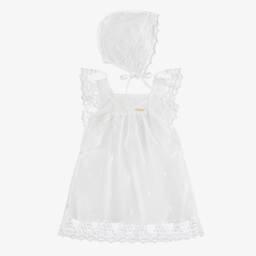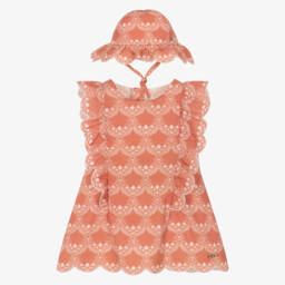 Lovely for a special occasion, this ivory ceremony dress for baby girls is by luxury brand Chloé. Made in a soft blend of cotton and silk, it has a double-layered scalloped collar, with pretty flower pattern embroidery around the scalloped hemline. It is fully lined for comfort and fastens with a concealed zip on the back. Coming with a pair of matching knickers, it is presented in a beautiful branded gift box.