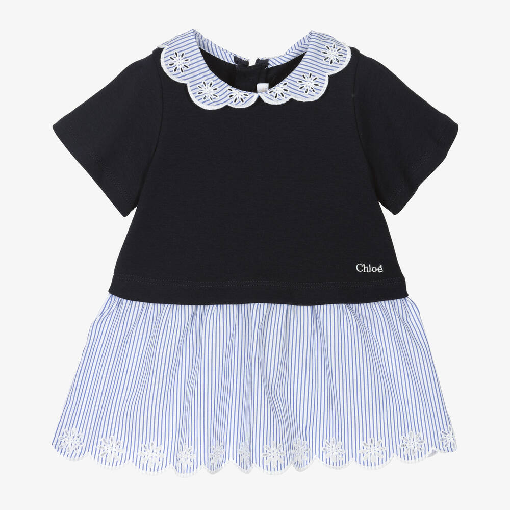 A lovely blue organic cotton dress for little girls by luxury brand Chloé. It has sweet scalloped trims, detailed with pretty flower pattern embroidery. The navy blue bodice is made in soft jersey and the striped skirt is gently gathered in lightweight poplin. There is a concealed zip fastening on the back and signature Chloé embroidery on the front.