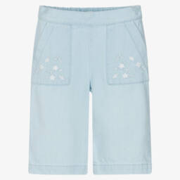 Blue cotton denim jeans for girls by Chloé, inspired by the adult collection. Designed with a washed and worn look, they are styled with five pockets and a wide-leg fit. Smaller sizes have an adjustable waist for comfort. The shiny gold tone popper fastening has subtle branding, whilst a larger leather logo patch is sewn on the back for instant brand appeal.