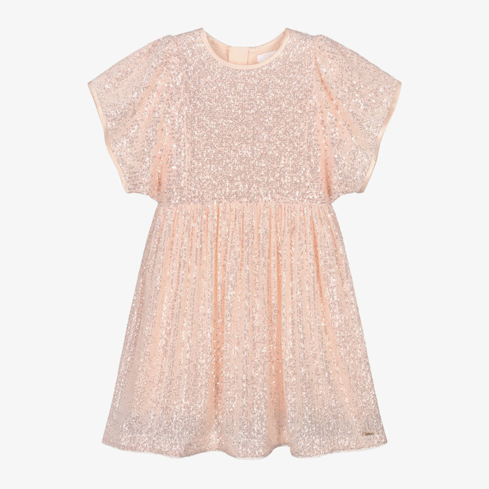 Pretty pale pink dress for girls by luxury designer Chloé, embellished with shimmering sequins that catch the light beautifully. Ideal for a special occasion, it has chic angel sleeves and a relaxed, floaty shape. Fully lined in soft cotton for comfort, it fastens neatly with a concealed zip on the back.