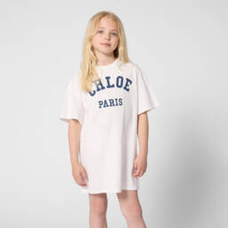 An elegant off-white cotton dress for girls by luxury French designer Chloé, inspired by the adult collection. This elegant style has a celestial star and ladder stitch embroidered design, with a gold-tone Chloé logo charm decorating the hemline. The short sleeves are flowy and the waistline gathers to create a delicate silhouette. A zip fastens discreetly on the back and a lightweight lining finishes the look.