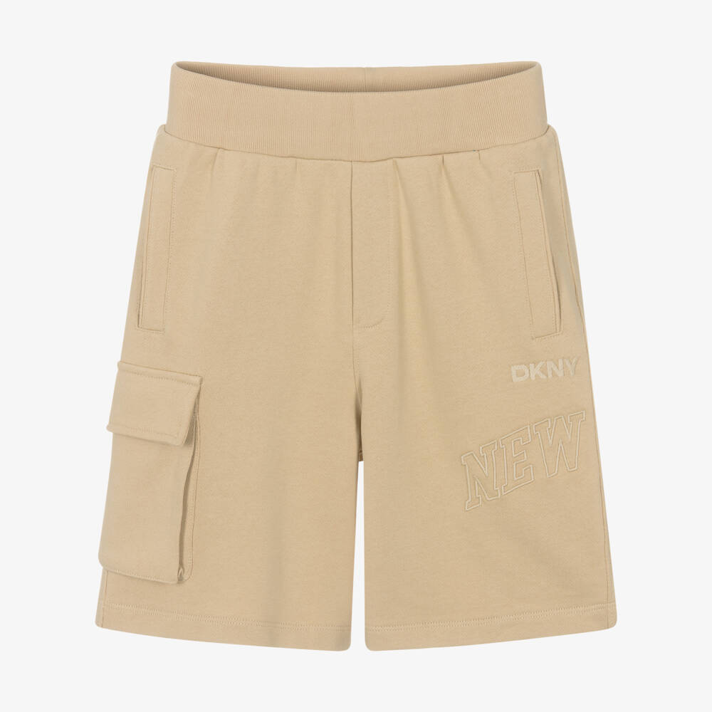 Mini-me beige cotton shorts for boys and girls by DKNY, embroidered with the brand's logo in tonal thread for a subtle designer look. This casual style is made in soft and comfortable jersey, with useful pockets and a ribbed elasticated waistband.
