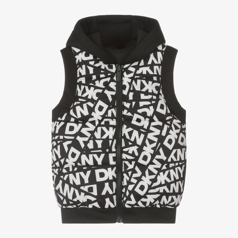 A stylish black and white reversible hooded puffer gilet for boys and girls by DKNY. Padded for warmth, this cool design is patterned on one side with a monochrome graphic logo print for instant designer recognition. The reverse is plain black, with subtle branding on the chest. There are useful pockets on both sides and it fastens easily with a chunky zip.