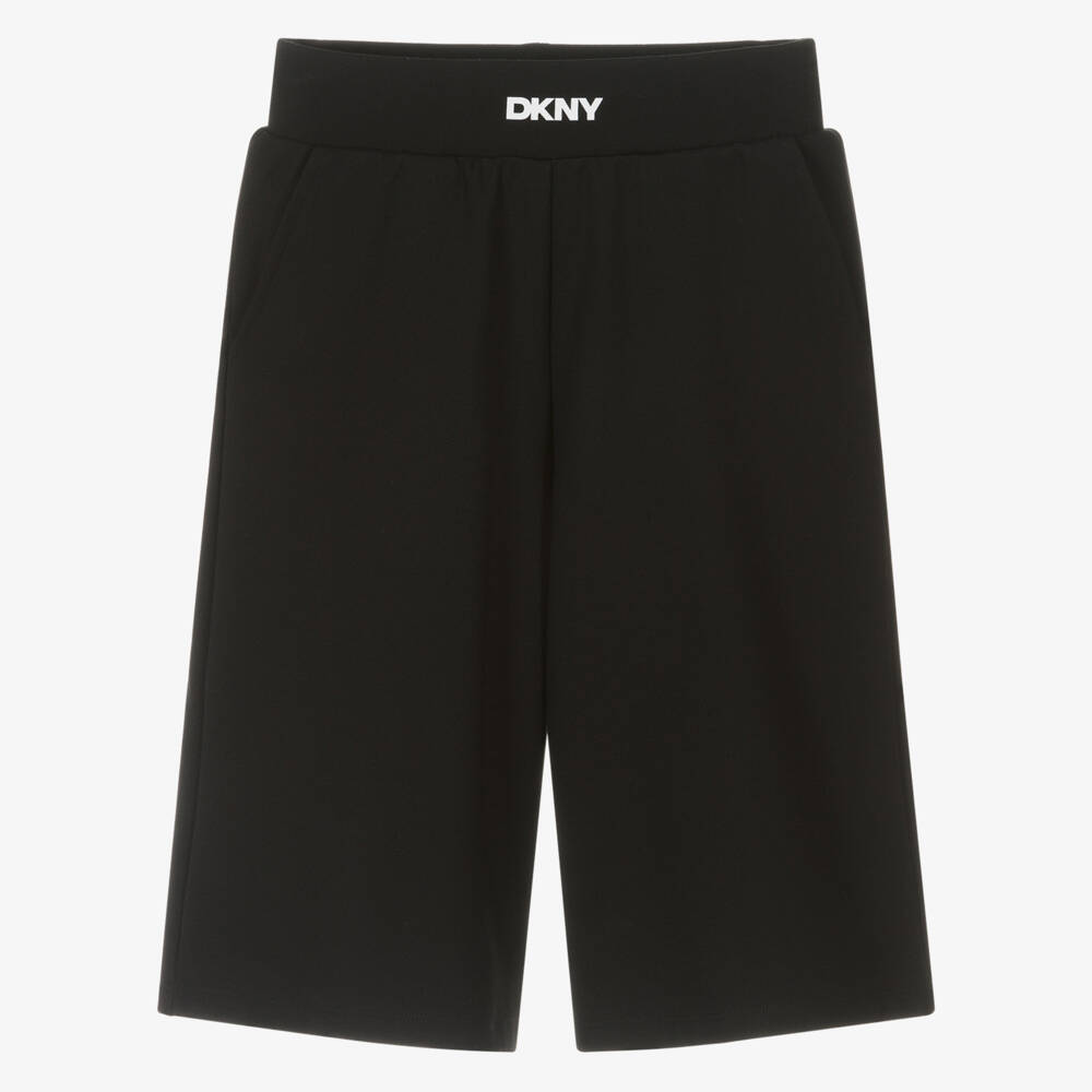 Black shorts for girls by DKNY, made in soft Milano viscose-blend jersey. Endlessly comfortable, they have a wide-leg, Bermuda-length fit, with an elasticated waist. They have four useful pockets and are easy to wear, simply pulling up. White logos on both the front and back provide instant brand appeal.
