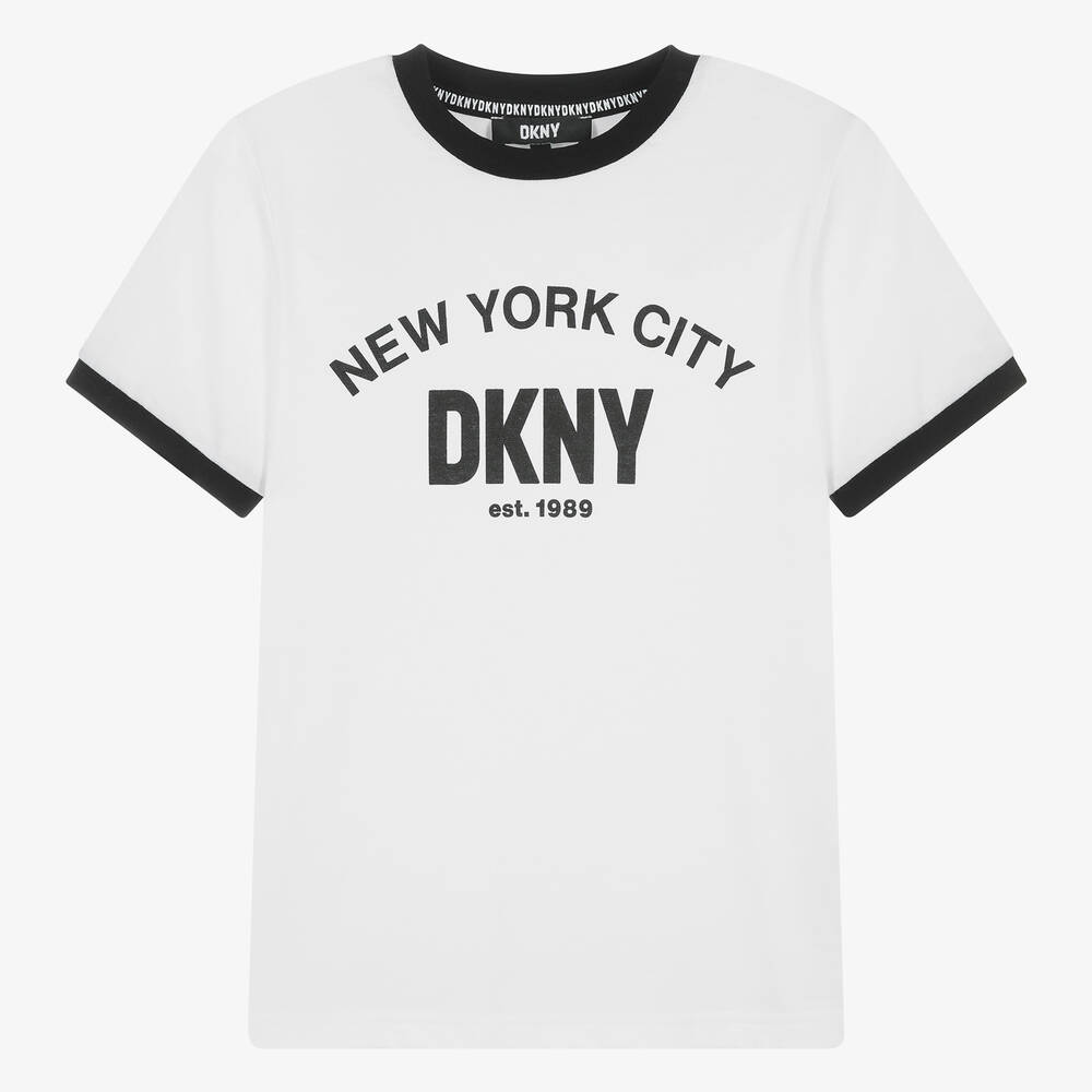 White T-shirt for teen boys by American brand DKNY, with a bold New York City logo print on the front. In line with the label's identity, this casual short-sleeved tee has lightly ribbed black trims on the neckline and cuffs. It is made from soft cotton jersey for easy, effortless dressing.
