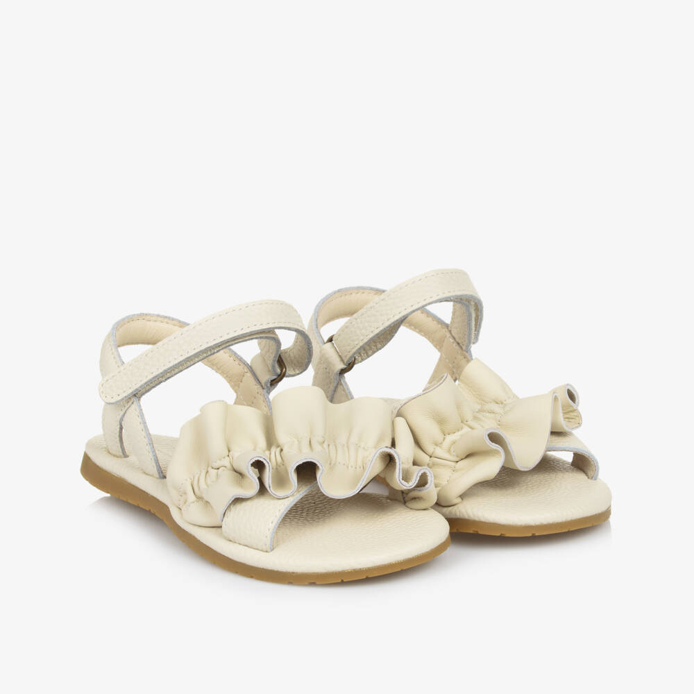 Lovely ivory sandals for girls by Donsje, decorated on the front with a pretty ruffle. Handmade in soft and supple leather, these comfortable shoes offer supreme comfort during the warmer months. Fastening with a velcro strap, they have a lightly cushioned leather insole and textured rubber outer sole for good grip.