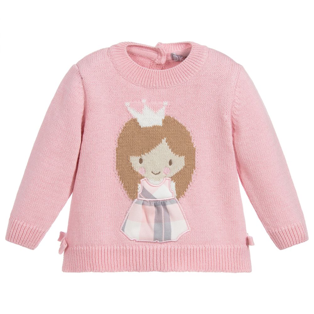 Adorable for younger girls, a pink knitted sweater with a cute princess motif on the front. Designed by Dr. Kid, the sweater is made from a soft cotton and acrylic blend, with stretchy ribbed edges. There are button fastenings on the back for easy dressing and cute bow trims on the hem.