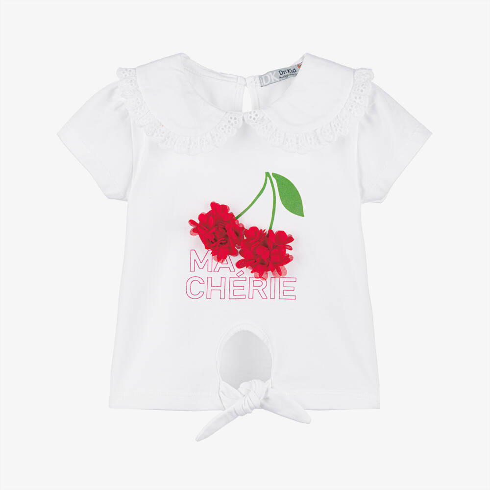 White T-shirt for girls by Dr. Kid, with a sweet broderie anglaise trimmed collar. Tying at the waist, it has a cherry appliqué on the front with a cute 'Ma Chérie' print.