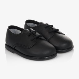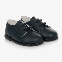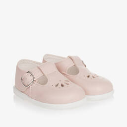 Dark beige first walker shoes for little boys and girls from British brand Early Days, in a traditional T-bar style. Made in soft faux leather with a charming punched hole pattern on the toes, they have a textile lining and a lightly cushioned insole for comfort. These classic shoes fasten with an adjustable silver buckle and have flexible non-slip rubber soles.