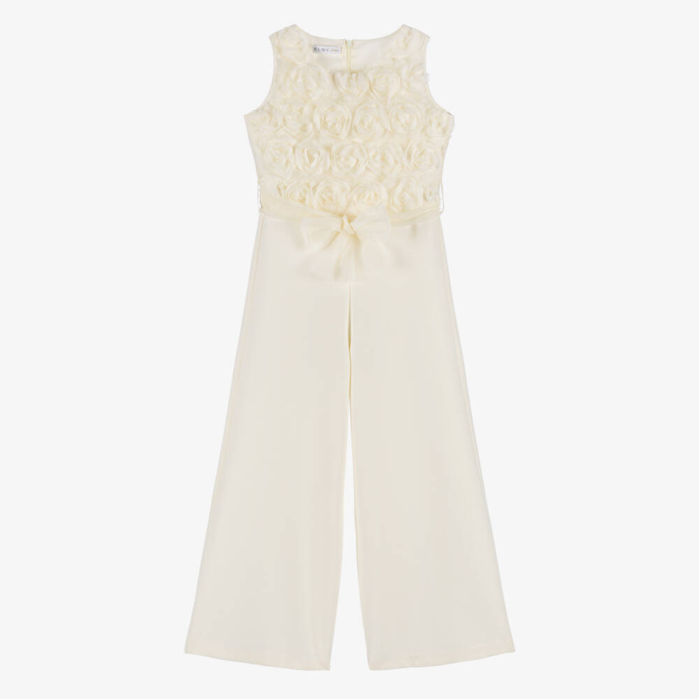 Sleeveless ivory jumpsuit for girls from couture by Elsy, with a chic, wide leg silhouette. Made in soft crêpe for a beautiful drape, the bodice is decorated with delicate tulle flowers and the waist is defined by a tulle tie belt. This stylish design fastens with a concealed zip on the back.