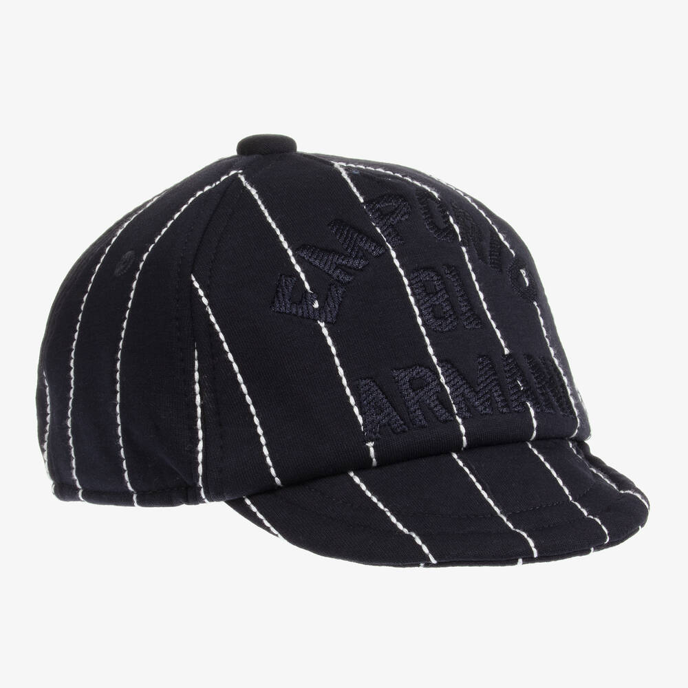 Navy blue cotton blend baseball cap for little boys by Italian designer Emporio Armani. In varsity style, it has embroidered white stripes and a logo on the front. It is made in comfortable jersey with a lightweight voile lining at the front and embroidered ventilation eyelets for comfort. It is elasticated around the back for a good fit.