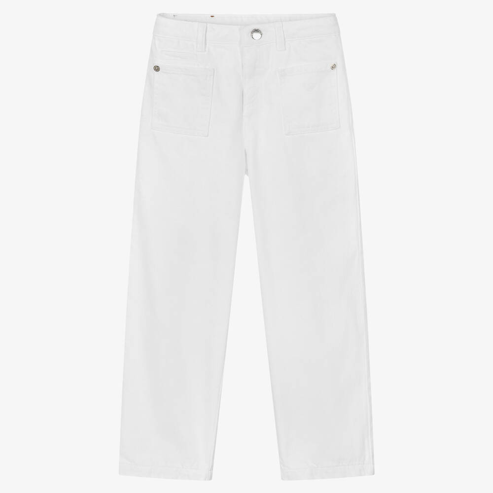 Stylish white jeans for girls by Italian designer Emporio Armani, made in mid-weight denim. Stylish and with straight legs, they have two patch pockets on the front, one with subtle Eagle logo embroidery. Fastening with a silver logo button and zip, they have a useful adjustable waist for an optimum fit.