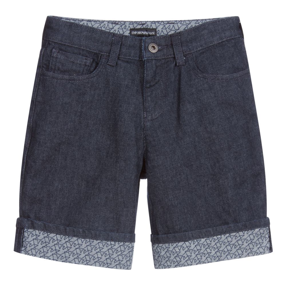 Teen boys blue cotton denim shorts by Emporio Armani. The interior has a navy blue Eagle logo pattern that is exposed when the hems are turned up. There are three pockets on the front and two on the back, one with a metal Eagle logo, the other with an Eagle logo print.
