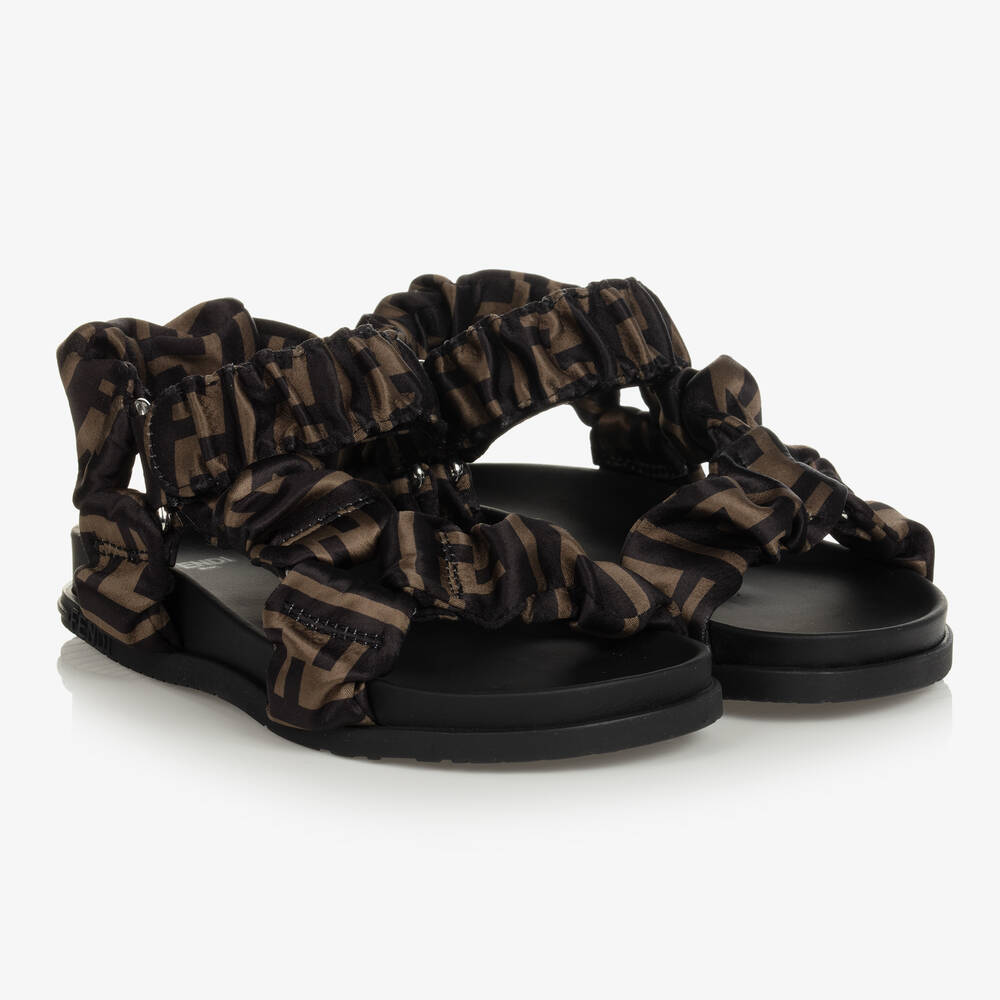 Achieve an instantly recognisable logo look with these stylish brown sandals for girls, by luxury Italian designer Fendi. Featuring the iconic brown and black FF logo on the satin uppers, they have on-trend scrunchie-style straps and a discreet velcro strap across the foot for an easy fit. Comprising comfort and style, they have a moulded leather insole and a rubberised non-slip outer sole. Upgrade your child's footwear fashion with these designer sandals, ideal for accessorizing any summer look.