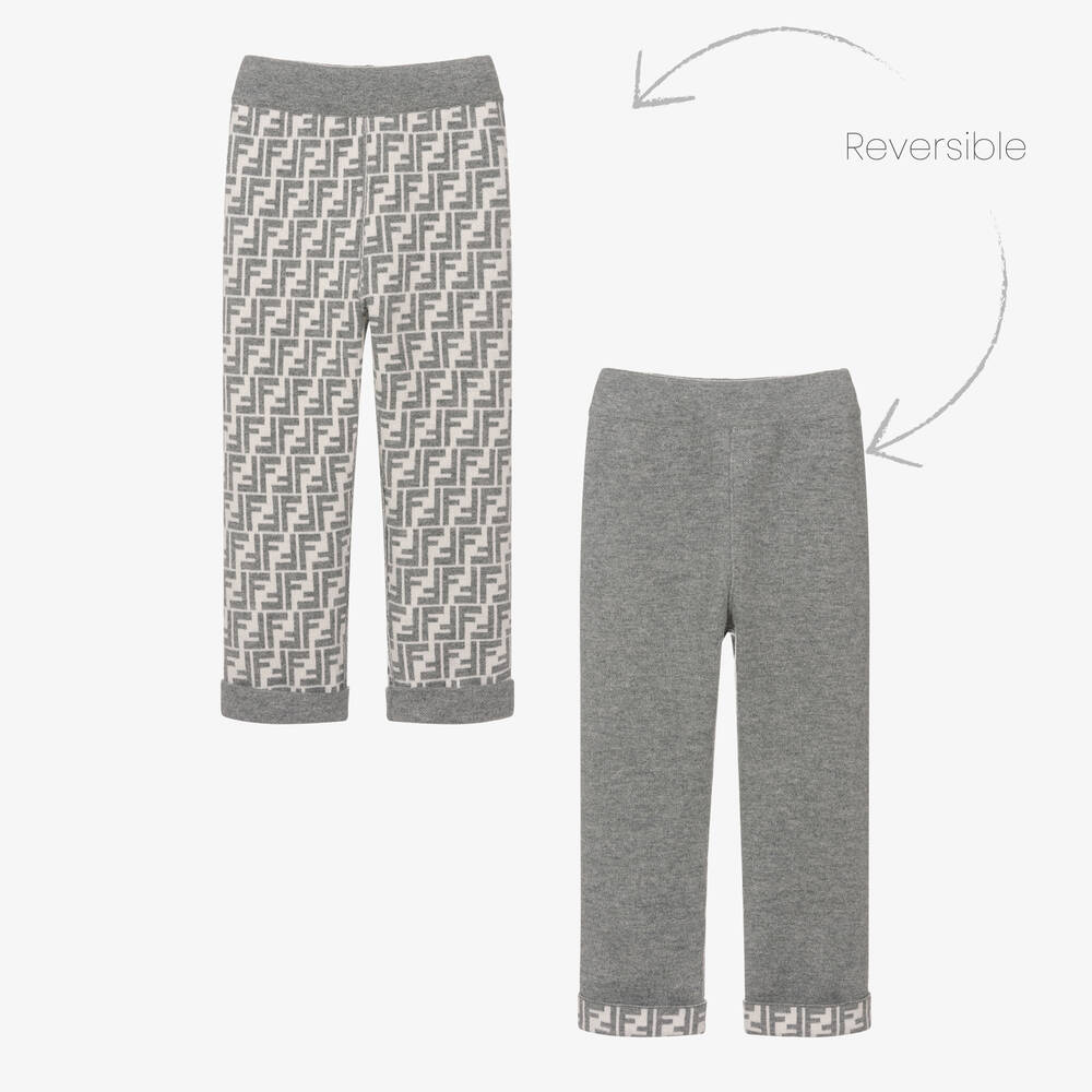 Beautiful grey wool and cashmere blend joggers by luxury brand, Fendi. Fully reversible, this gorgeous design can be worn two stylish ways and has a grey and ivory FF jacquard logo pattern on the reverse. The joggers have a stretchy, elasticated waistband for comfort and fit.