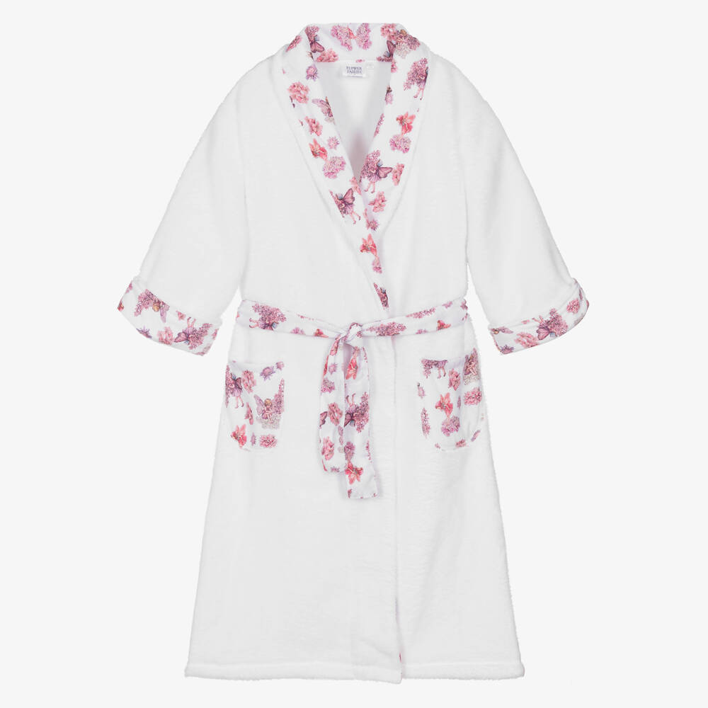 Lovely white Flower Fairies™ by Childrensalon dressing gown for girls. Made in super soft plush fleece, it is trimmed with a delightful pink and purple Flower Fairies print from the original illustrations by Cicely Mary Barker. It has useful front patch pockets and an attached sash belt.