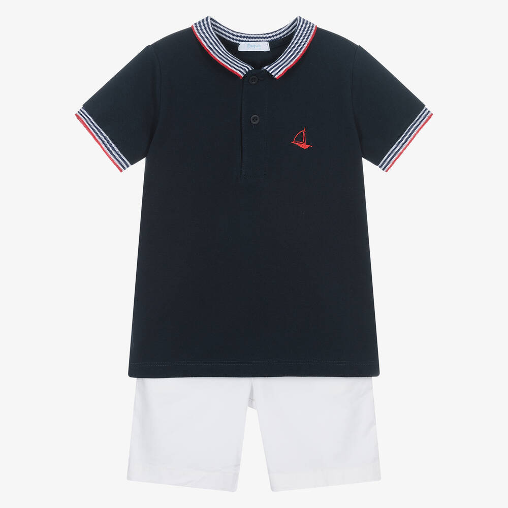 A classically styled navy blue and white cotton shorts set for boys by Foque. Made in soft piqué, the polo shirt has a red sailing boat embroidered on the chest and red, white and blue striped trims. The coordinating chino-style shorts have slanted front pockets and an adjustable waistband to ensure a great fit.