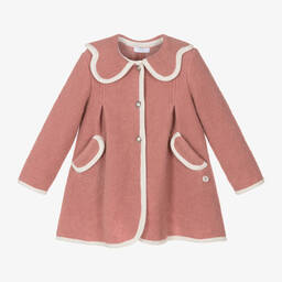 Pretty blue coat for girls by Spanish brand Foque, made in soft felted wool. It has a gentle A-line shape, with ivory knitted trims and pleats on the front and back. There are pockets on the front, a mother-of-pearl logo charm and silver metal button fastenings. The collar has lovely scalloped-shaped edging and there is a sweet ivory knitted bow on the back for a lovely finishing touch.