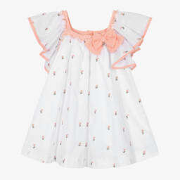 A lovely white cotton dress for younger girls by Foque, patterned with a summery peach print. Beautifully lightweight, the dress has ivory lace trims adding a traditional touch and button fastenings on the back. It comes with a pair of matching knickers to complete the sweet look.