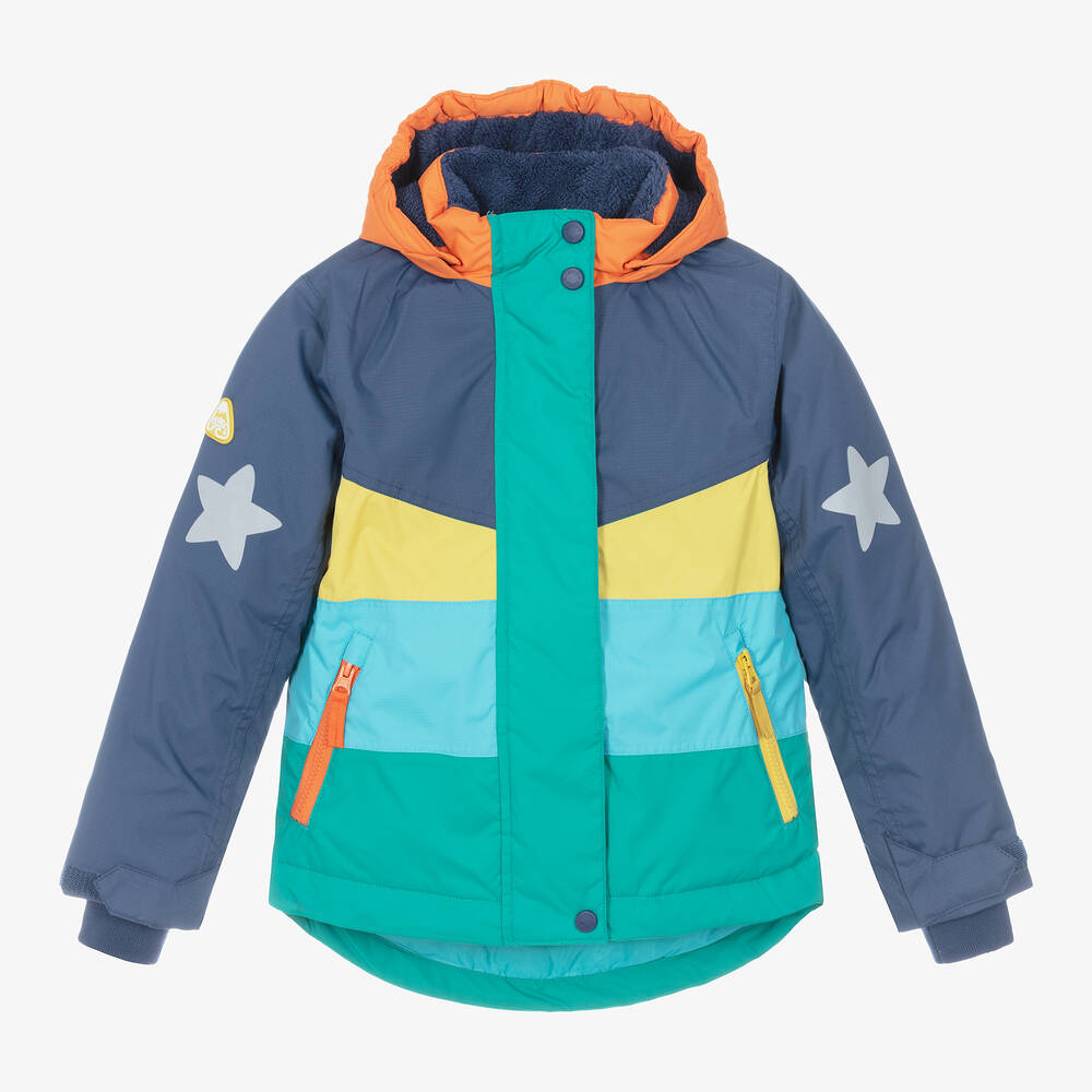 A colourblock padded ski jacket for boys by Frugi, with a blue, yellow, green and orange design. Lined in soft, cosy fleece for comfort and warmth, it has zipped pockets on the front, a useful internal pocket, and a pass pocket on one sleeve. The adjustable cuffs have wrist gaiters and there is a popper-fastening snow skirt for extra protection. It has zip and popper fastenings on the front with a velcro storm placket and high neck to help lock the warmth in. The hood detaches with poppers for an alternative look and there are reflective details for enhanced visibility.