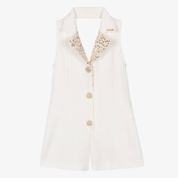 A black playsuit for older girls from H.Love by Fun & Fun. Made in soft crêpe fabric, this smart style has gold medallion buttons on the bodice and a lapel collar. It has discreet side pockets and a zip fastening on the front. The playsuit is complete with an adjustable belt to shape the waist.